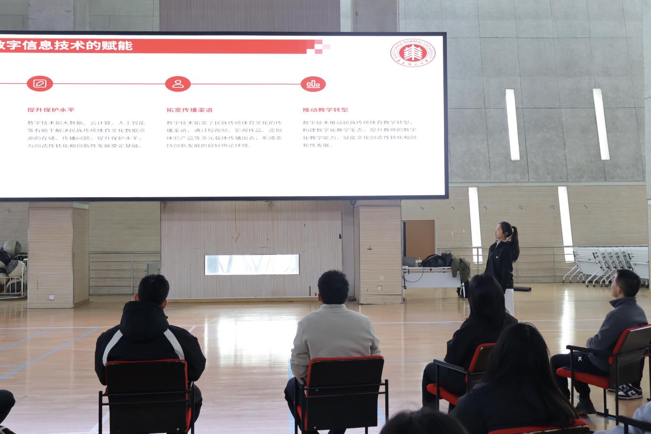 活动伊始,体教民传学硕党支部党员范瑞诗以“焕发民族传统体育生命力”为题进行了微党课宣讲,介绍了中华传统体育文化不仅是中华文化的重要组成部分,更是连接历史与未来的纽带。她号召时代青年要以实际行动推动民族体育文化创造性转化和创新性发展,让传统文化焕发新的时代光彩,为实现中华民族伟大复兴的中国梦贡献力量。