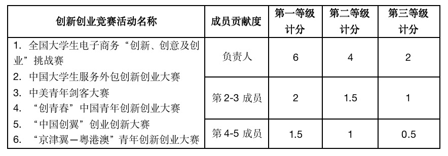 2.创新创业上限不超过 6分。如有多个可获加分情形的,就高计一次。 3.创新创业的赋分由学院学术专长专家审核小组经材料审核、答辩程序后签字确认有效,其中创新创业重要竞赛活动在学院初审的基础上报学校相关职能部门复审。 | |