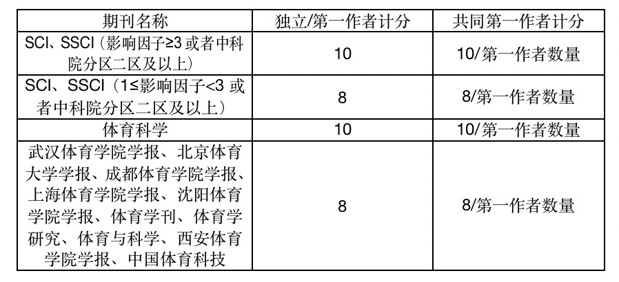 说明: 1.科研成果原则上仅限学生本科阶段在上述核心期刊上以独立作者或第一作者发表的与学业相关的科研论文(其中SCI、SSCI发文需与体育学科相关)。如为共同第一作者的,根据共同作者的数量相应核减。 2.科研成果实行代表作评价,上限不超过 10分。 3.科研成果的赋分由学院学术专长专家审核小组经材料审核、答辩程序后签字确认有效。 |