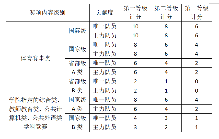 说明: (1)限学生本科阶段作为唯一队员或主力队员参加的纳入学院推免竞赛认定范围的国内权威竞赛或相当级别的国际赛事(竞赛清单见附件,加分规则见上表)。体育赛事类(除省部级B类)第一等级为第 1名,第二等级为第 2-4名,第三等级为 5-8名;省部级B类第一等级为第1名,第二等级为第2名,第三等级不加分,主力队员人数须经教练(团队)认定签字。其他类学科竞赛第一等级为一等奖,第二等级为二等奖,第三等级为三等奖(如有特等奖,第三等级为二等奖),每支队伍主力队员不多于 5人。 (2)竞赛获奖如有多个可获加分情形, 累计加分,就高计一次,上限为 10 分。 (3)竞赛获奖赋分由学院学术专长专家审核小组经材料审核、答辩程序后签字确认有效。其中,涉及学科竞赛综合类的,经学院初审后,提交学校相关职能部门复审。 | |