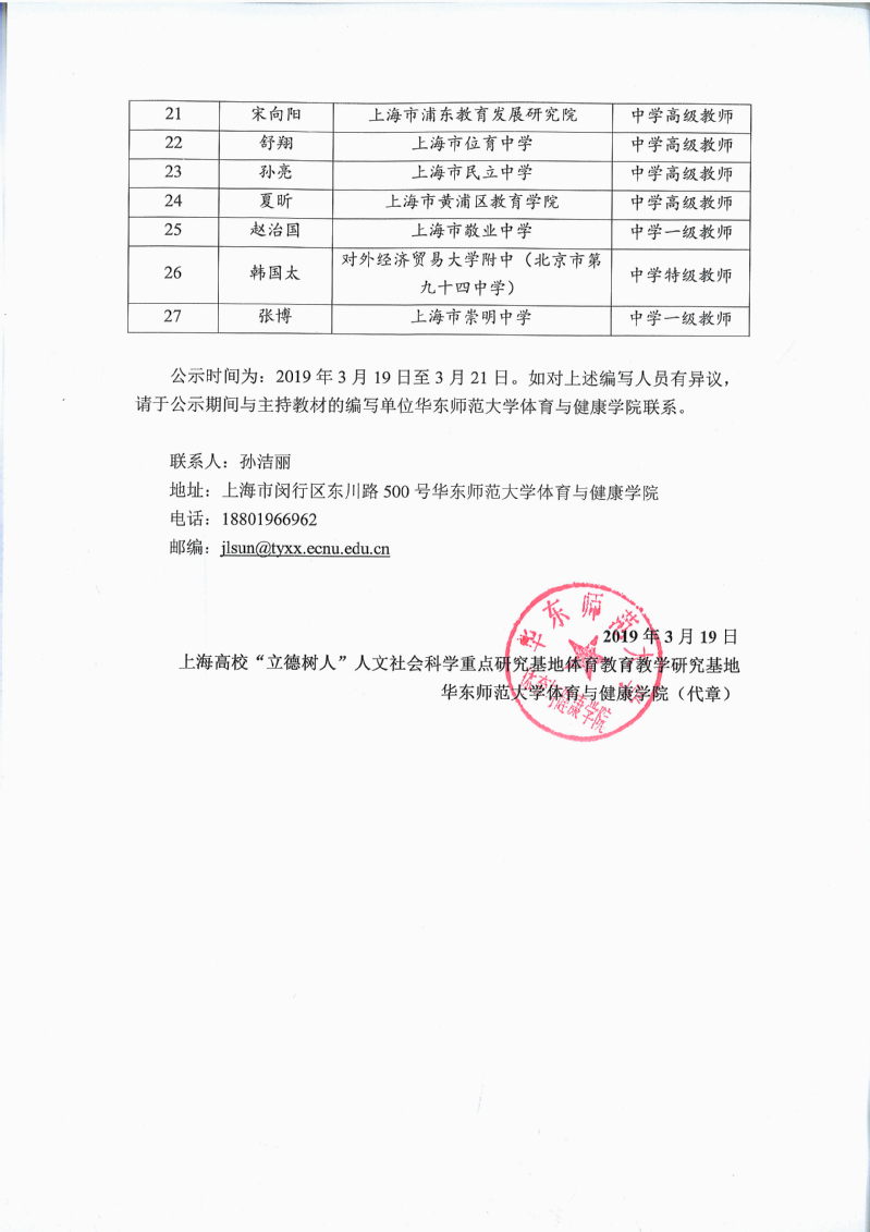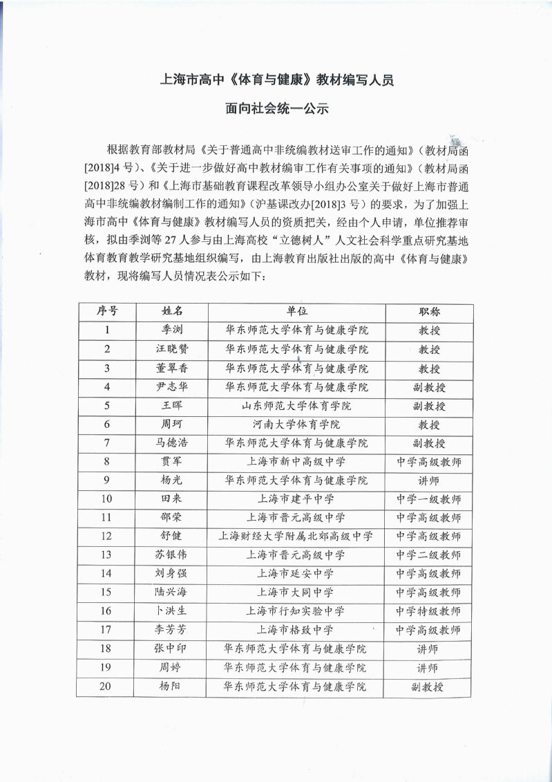上海市高中《体育与健康》教材编写人员面向社会统一公示
