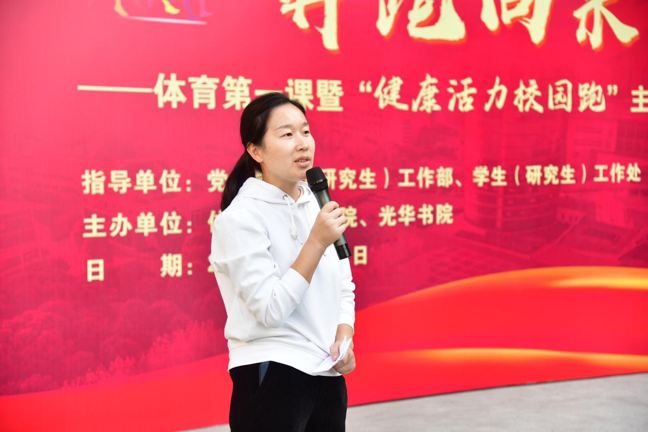 王新燕在致辞中讲到,举办本次活动的初衷就是要“想国家所想、急国家所急、应国家之所需”,在服务“国之大者”中践行大学之道。她勉励参赛队员挽起裤腿奋力跑,在体育运动中释放压力、享受乐趣,以健康的体魄、乐观的心态、顽强的意志迎接挑战,共同迈向卓越!
