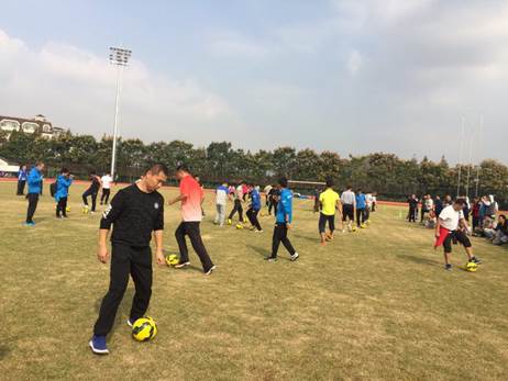 本次培训形式多样,采取了专题讲座和参与式讨论相结合、案例展示和互动交流相结合、实践培训与拓展视野相结合、现场观摩和反思研讨相结合的模式。不仅邀请了季浏教授、潘绍伟教授等“学术大咖”为老师们介绍初中体育与健康课程的基本理念、内容和方法,和学员们共同探讨初中教师应该具备的基本素养以及初中体育与健康改革中可能出现的问题和对策。还邀请了部分初中体育教研员和优秀的一线初中体育教师,通过案例展示的方式,引导学员们开展互动与交流,帮助学员了解和熟悉当前普遍得到认可的初中体育教学模式、策略与方法,以及初中体育教师专业发展的基本途径。值得一提的是,本次培训邀请了“聚运动”团队为学员们介绍国外在体育课堂的优秀经验,拓宽学员们的视野。“聚运动”团队将为期一天的课程拆分成两个部分,上午为体育教学理论课,下午则是运动实践课。许多老师对于实践课的期待溢于言表,在得知实践课开始的瞬间竟然如初中学生一样高呼起来!这也让“聚运动”的教员们激动欣慰,毕竟未来学生们的足球之路,将由这些老师们一同开拓。教练们通过足球、绳梯、标志帽、等器材,向各位老师展示了如何设计一节完整的、循序渐进的、并具有高趣味性的体育课。老师们踊跃地参加到各个实践环节中,并感叹一堂体育课的设计到执行都必须相辅相成,肢体语言等细节对于调动学生积极性的重要性不言而喻。所有参与的老师们在练习中都一丝不苟,不论男女,不论年龄。令人不禁感叹:若校园中的体育老师都能在教学上如此求知若渴,校园足球的蓬勃发展怎会遥遥无期?
