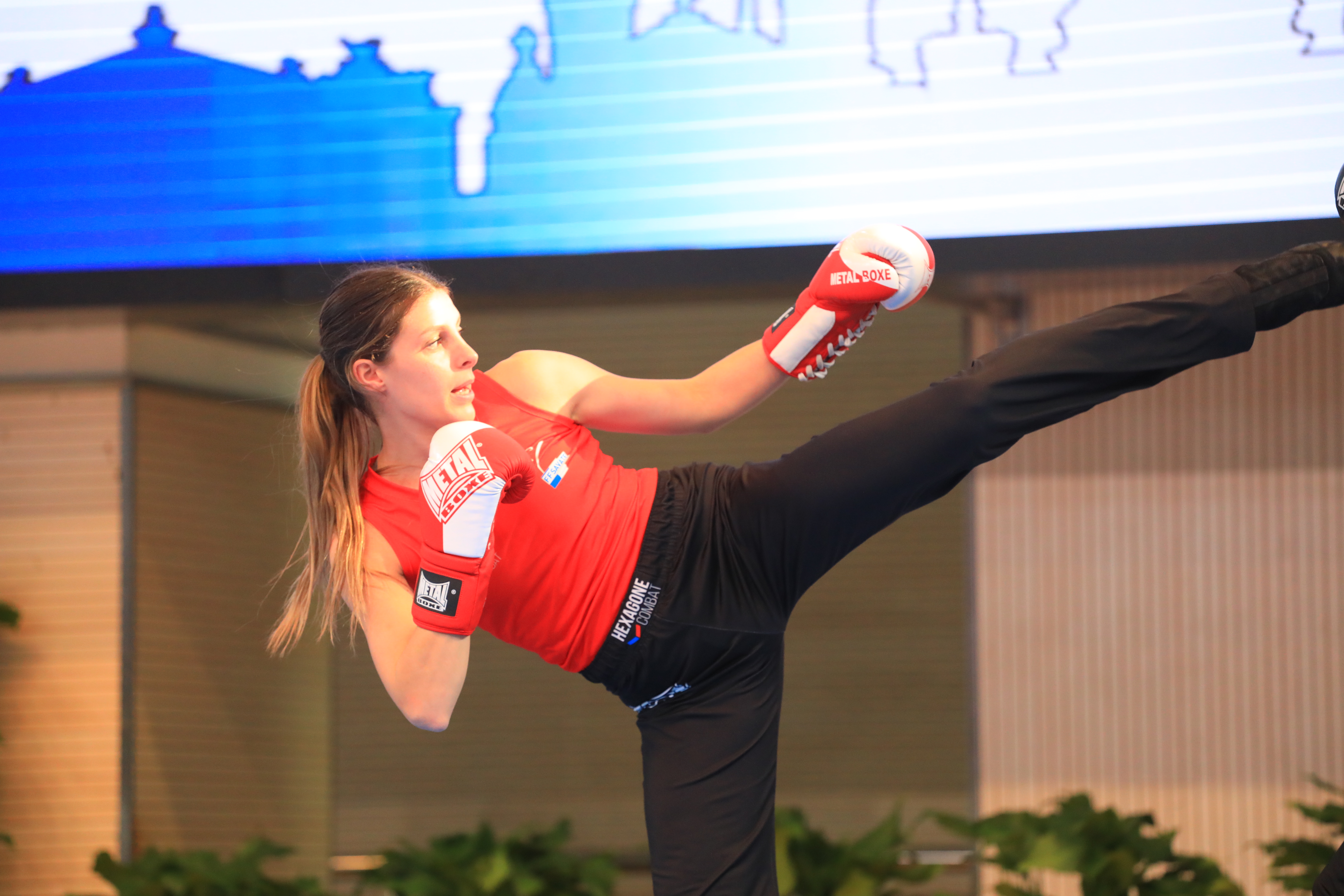 2024年3月24日,法式拳击冠军代表团到访正妹av ,一场别开生面的中法拳击世界冠军见面会在闵行校区举行,法式拳击世界冠军尼娜·贝尔康迪和阿米纳·费达尔共同登台展开了精彩的表演赛,展示了法式拳击的前后手直拳、踢击等要领动作。